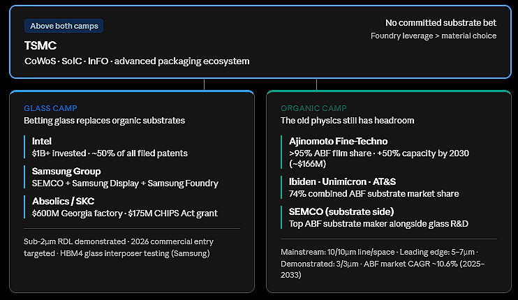 The glass camp believes glass substrates will replace organic substrates as the foundation of AI chips. Intel has invested over a billion dollars and holds nearly half of all patents in this space. Samsung has assembled the most ambitious vertical integration of any player, with its SEMCO subsidiary handling glass-core substrates, Samsung Display contributing large-area glass-processing expertise, and Samsung Foundry covering packaging integration. Absolics, a subsidiary of SKC, built a $600 million factory in Georgia and secured $175 million in US government support through the CHIPS Act.