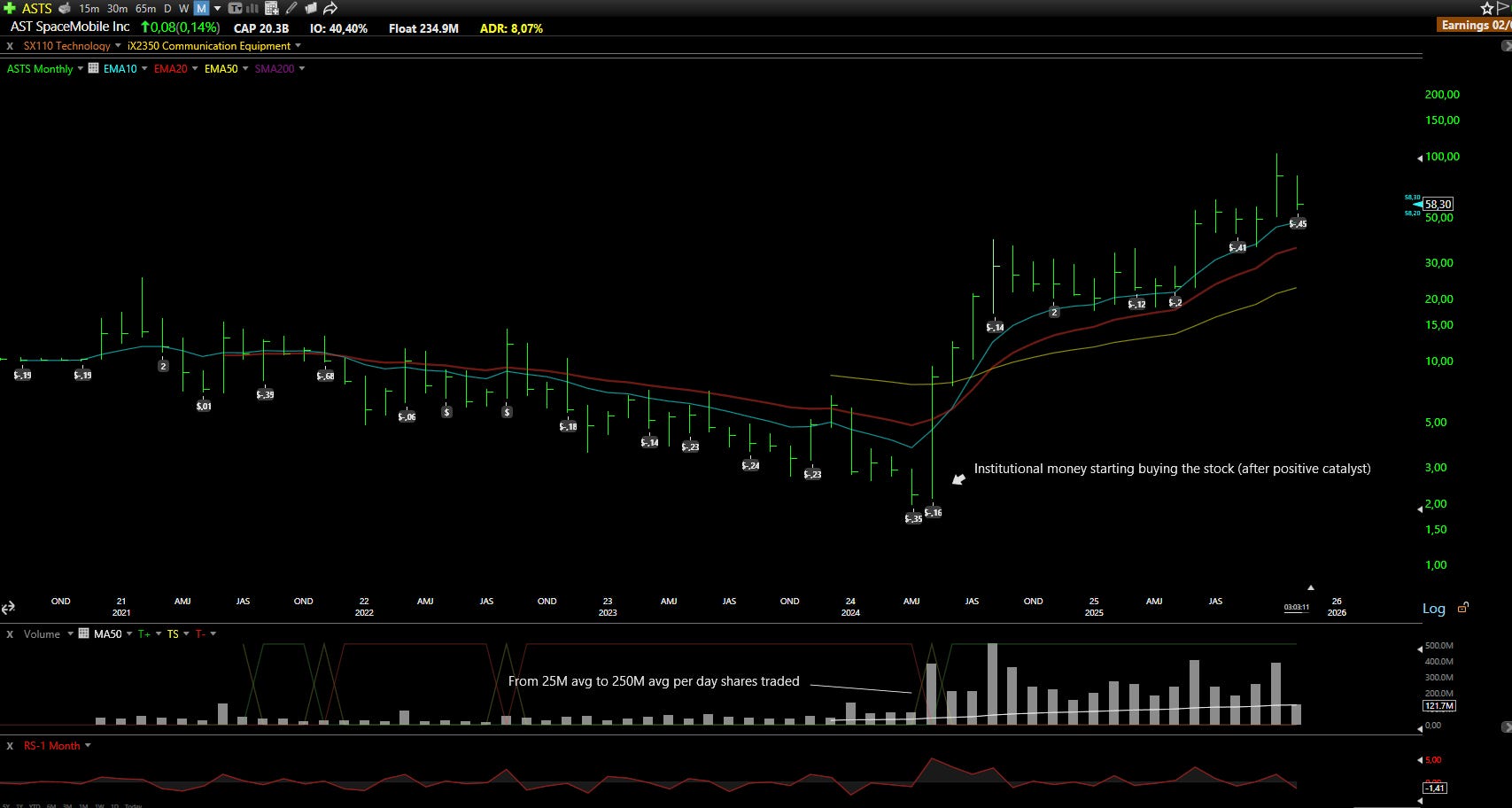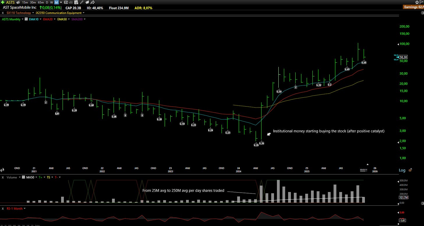 In this example, ASTS registers a dramatic surge in monthly volume after a major news event broadened the company’s media coverage and prompted institutional investors to take notice and establish positions. Over the ensuing roughly 18 months, the share price climbed from $3.00 to $100.00.