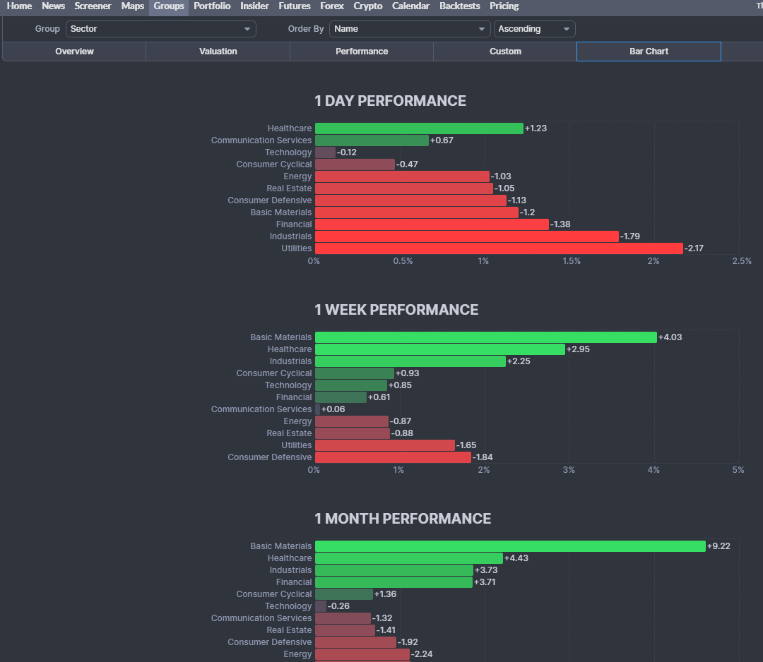 Finviz — Sector analysis, screening, news, insider trading (free)