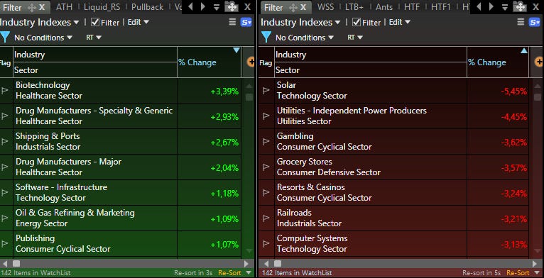 Intraday Monitoring Tools: During market hours, we have custom indicators that highlight the best-performing stocks in real-time, track sector rotation throughout the day, and measure overall market breadth as it evolves. This helps us stay nimble and adjust our approach based on what’s actually working in the current environment.