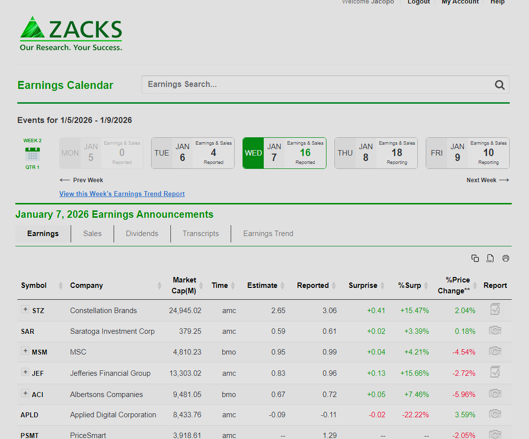 We use Zacks primarily for one thing: staying on top of earnings. The earnings calendar shows us which companies reported the previous day and which are reporting today, along with consensus estimates and actual results.