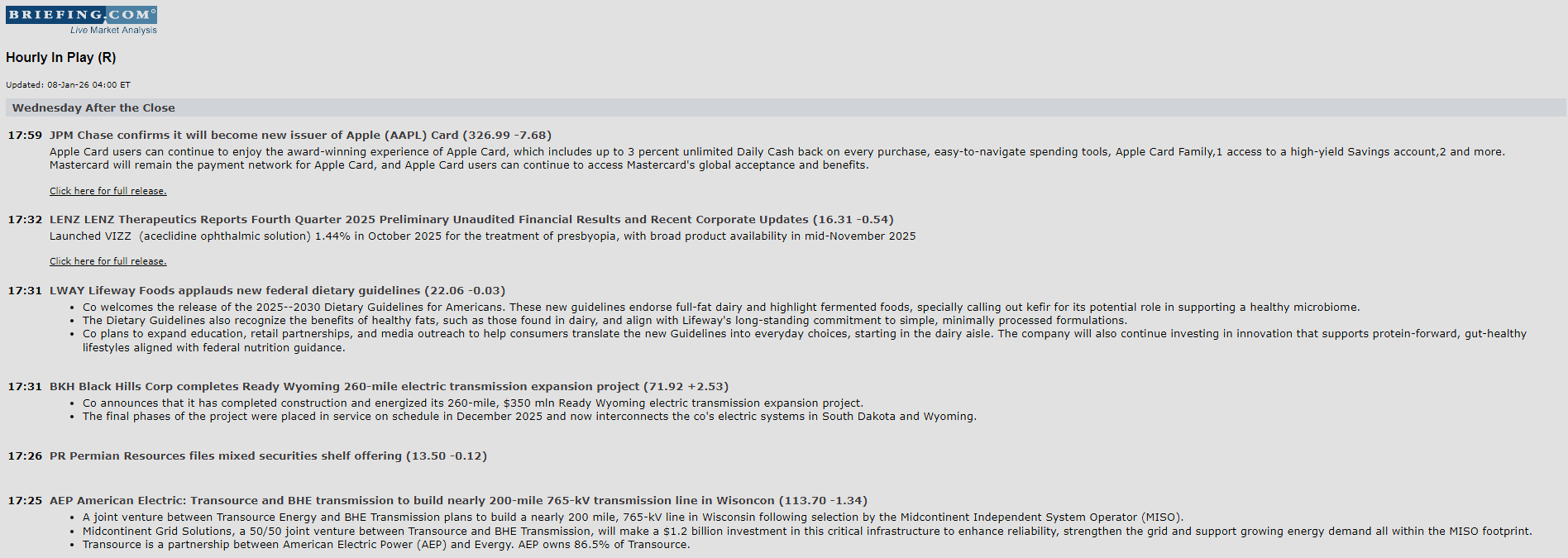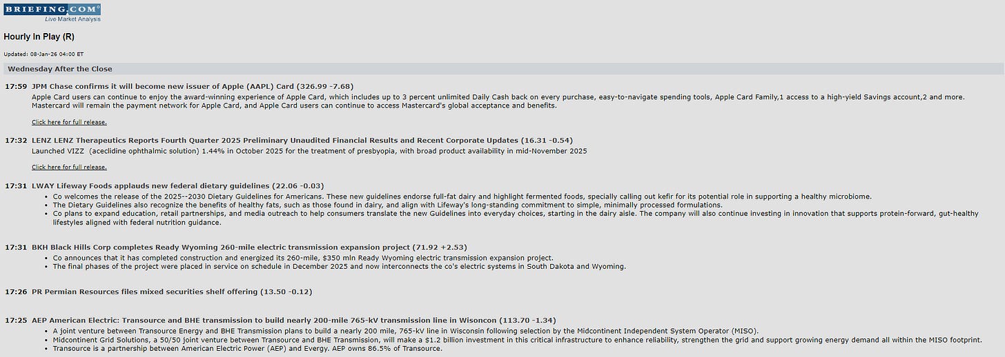 This is our morning ritual. Before the opening bell, we’re on Briefing.com getting a comprehensive view of what’s moving the market. The platform aggregates news across all major stocks, sectors, and indices, giving us a quick but thorough snapshot of the overnight action.