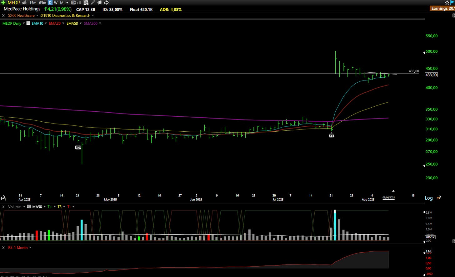 Why watch? ⚕️ Similar to FIX, MEDP had a significant gap up on strong earnings. The stock has since pulled back on low volume and is consolidating over the 10-day EMA. With volume drying up nicely, the stock appears poised to reclaim the $436.00 level, which marks the low of the earnings gap-up day.