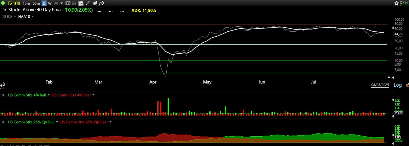 The T2108 indicator is giving us a reading of 44.76 and is currently stabilizing under its 10-day moving average, which is not a positive sign for the bulls. This confirms that the rally has been losing steam since the end of July. While the readings from the T2108 are somewhat lighter than what we've seen from other internal measures like the T2118, they still point to the same conclusion: the market's advance is becoming narrower and less supported.