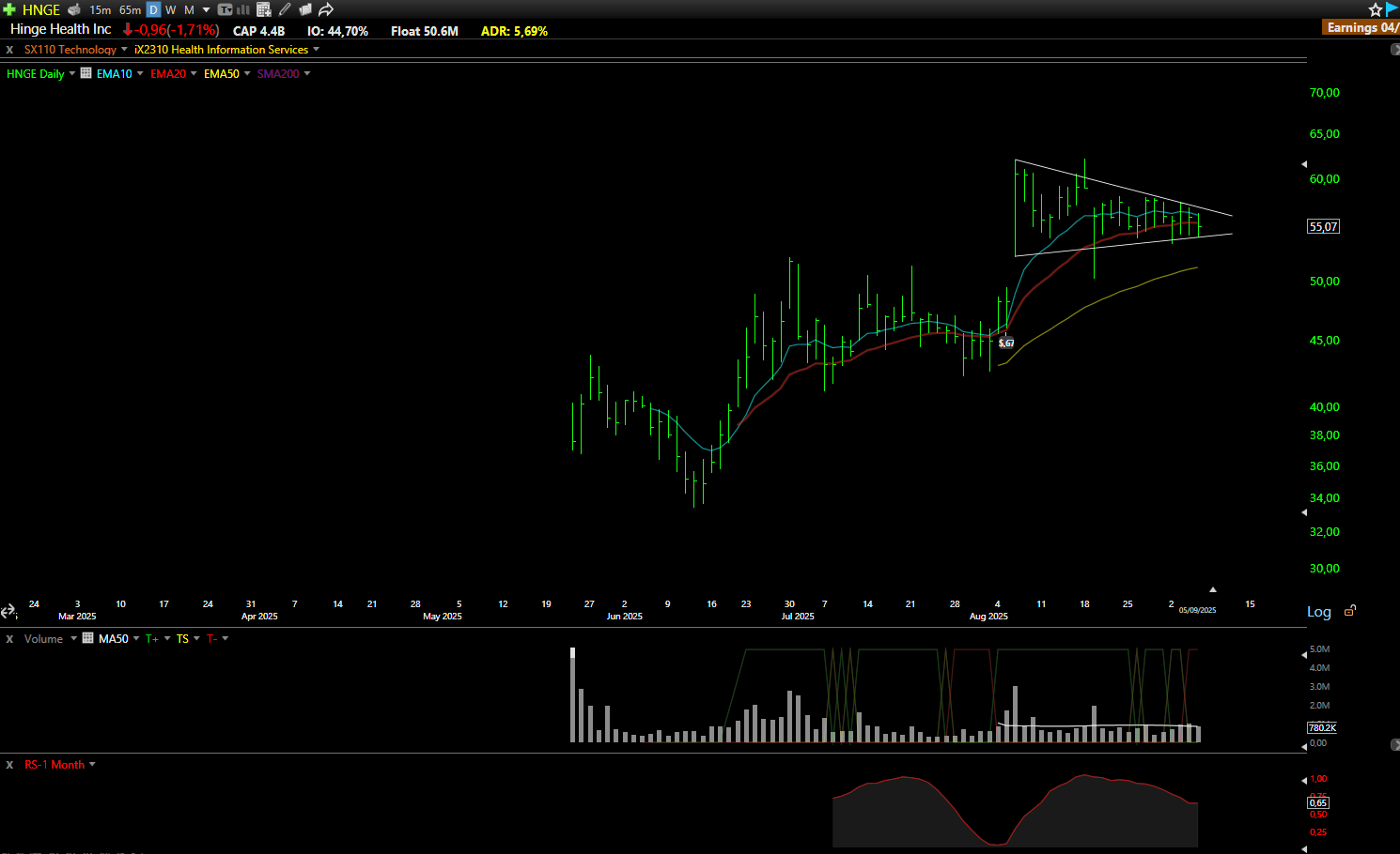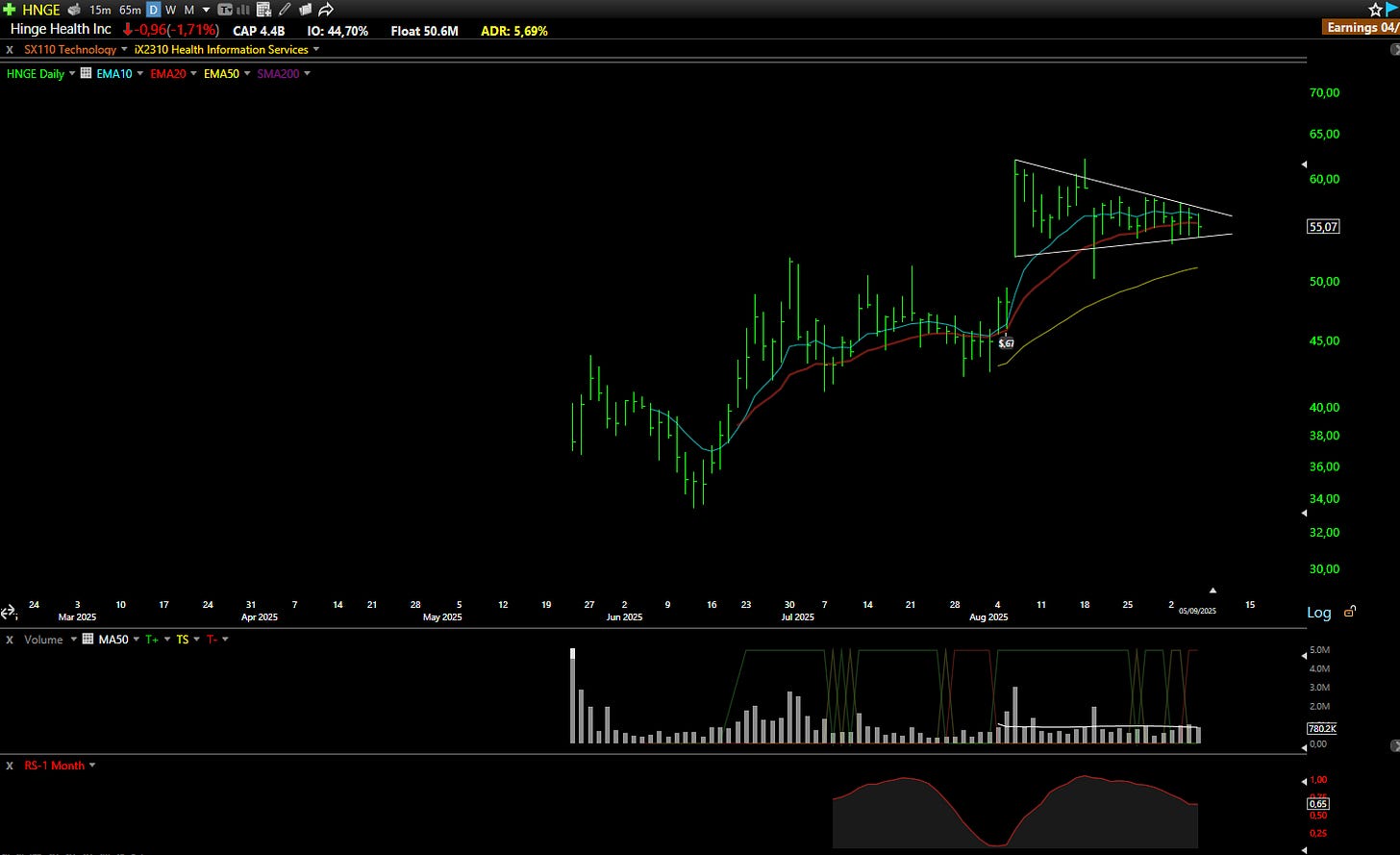 Why watch? Hinge Health delivered a strong first public earnings report, with revenue surging 55% year-over-year to $139.1 million. While the company reported a significant operational loss of $580.7 million, this was largely due to IPO-related stock-based compensation. The stock is consolidating near $57.00, and a breakout above this level with volume could attract more attention to this high-growth digital health name, offering explosive upside potential.