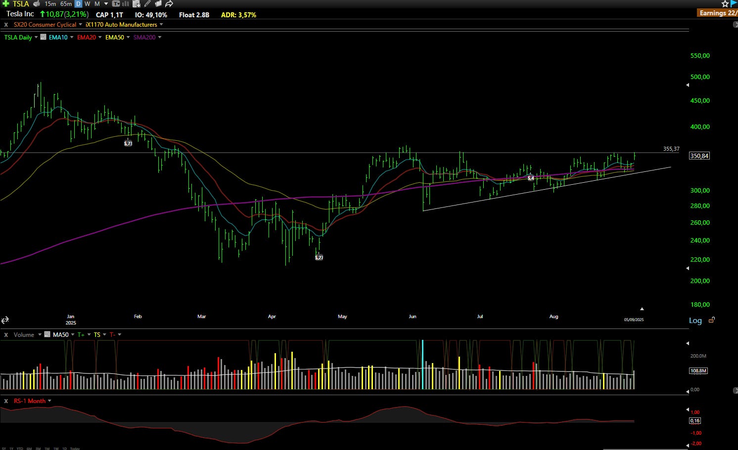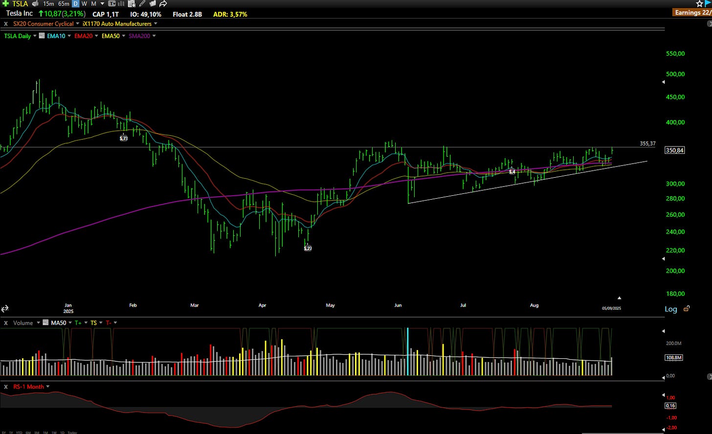 Why watch? From a technical perspective, Tesla's chart is currently one of the most constructive setups in the market. An analysis of the daily, weekly, and monthly timeframes reveals a powerfully bullish posture. Should broader market sentiment remain cooperative, a decisive breakout above the $355.00 resistance level, particularly on significant volume, could act as a major catalyst. Such a move would likely fuel a substantial advance, with an initial price objective near the psychological $400.00 mark.