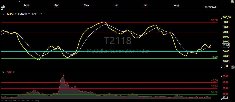 The T2118 is nearly flat, moving from 44.8 last week to 42.92, indicating no significant change in market breadth. Similarly, the Volatility Index (VIX) has remained stable, shifting from 15.36 to 15.18. These indicators confirm the lack of clear direction, reinforcing our decision to remain on the sidelines.