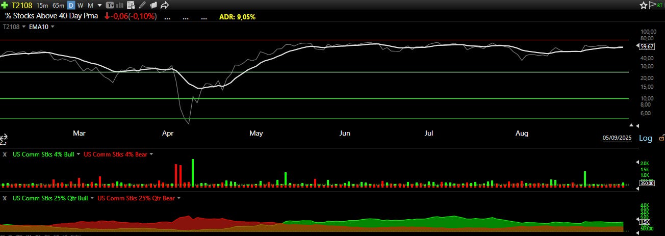The T2108 indicator has shown little movement this week, slipping slightly from 61.39 to 59.67. This near-flat performance highlights the ongoing choppy action in the market, with no significant change or added clarity. The lack of momentum suggests that the market remains indecisive, leaving investors waiting for a more definitive signal.