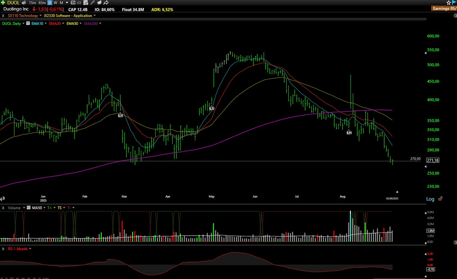 Why watch? Duolingo has experienced a severe 44% downturn over the last 20 trading sessions, a remarkably sharp correction following what was a stellar earnings report. This price action has brought the stock down to a critical support level around $270.00, a zone that has been successfully defended on three separate occasions since late 2024. For a fundamentally sound company with a strong track record, this technical confluence presents a compelling risk/reward scenario, making it an attractive candidate for at least a technical bounce play.
