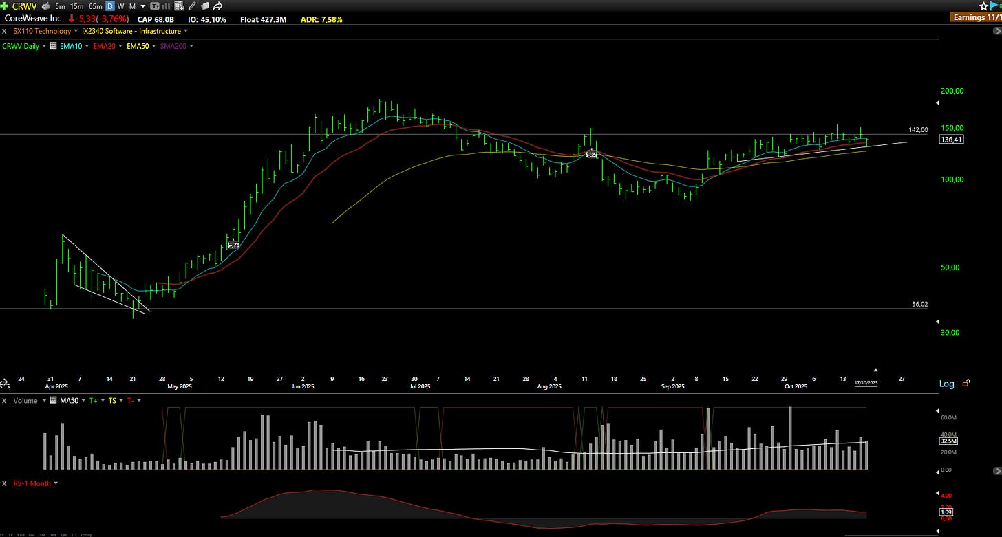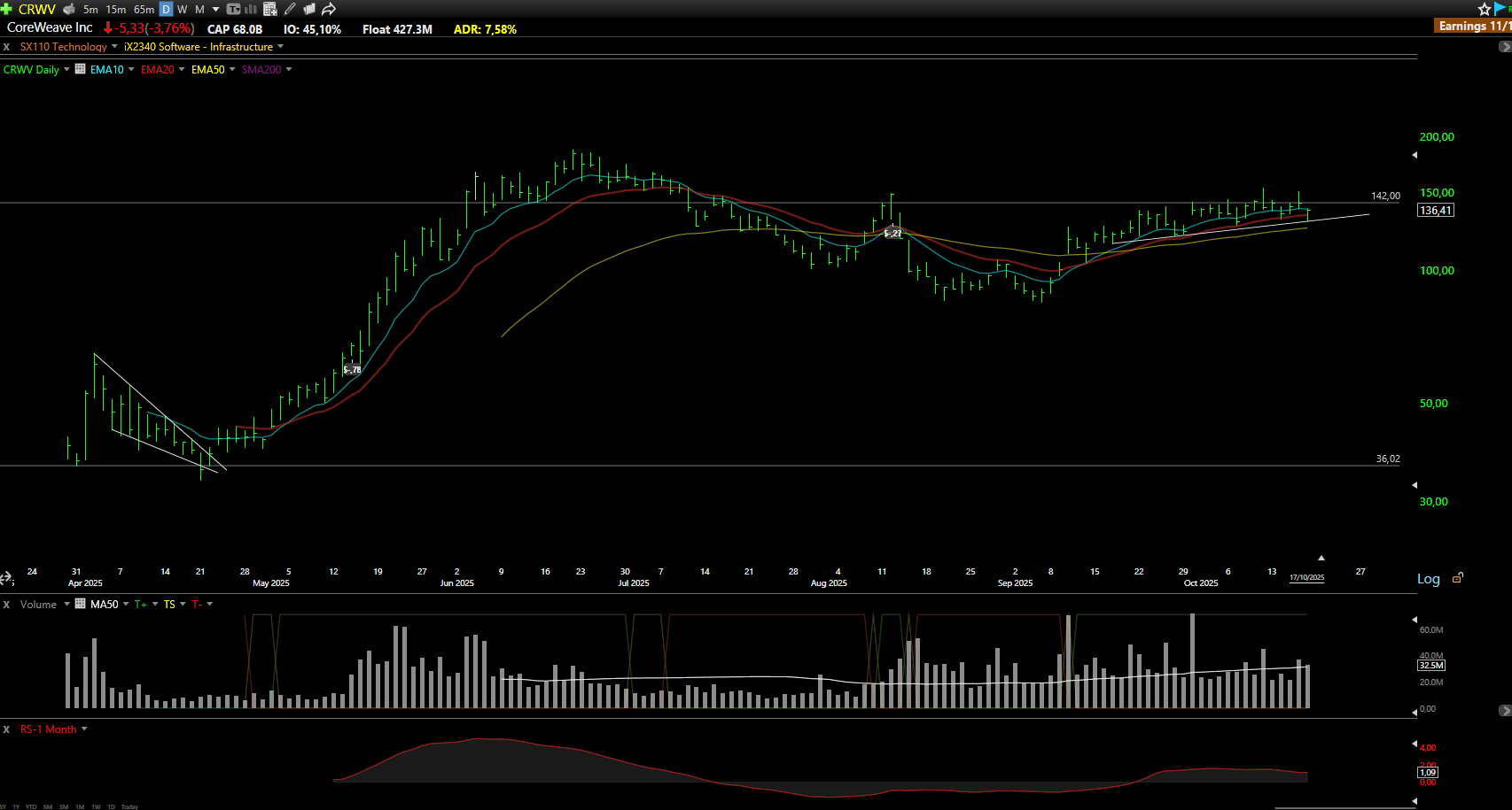 Why watch? CoreWeave is evolving from an AI cloud hardware provider to a full-stack agentic infrastructure platform, targeting the AI agent revolution. The companyâs acquisition of OpenPipe and its focus on reinforcement learning position it to capture higher-margin software and orchestration revenue beyond just GPU compute. Rapid sales growth, an expanding backlog, and deepening customer integrationâincluding recent large deals with major companies like Metaâsupport a long-term thesis of durable demand and high switching costs. Technically, the stock has attempted to break over $150.00 several times without success, but it has never lost the 20-day EMA, making a series of higher lows. A break over $142.00 with volume could initiate a new uptrend.