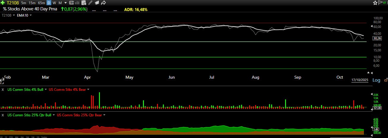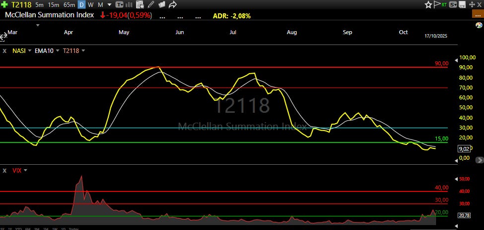 Friday gave one clean tell: VIX bled hard. Thatâs a positive for next week, a door cracked open. Still, T2118 and T2108 keep sagging. Weâre waiting on the hook, a turn back over the 10âday period that says participation isnât just a rumor. Until those two clear the line, new exposure is a maybe at best.