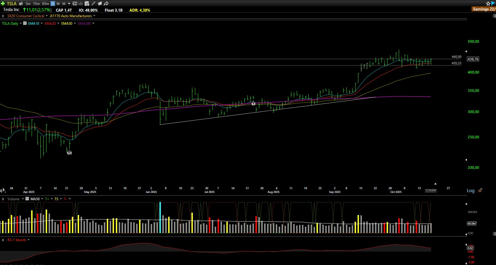 Why watch? The stock has been sandwiched in a consolidation range between $420 and $440 since the beginning of September. While Friday presented a potential entry, the high volatility in the current market and the weekend ahead made opening a new position inadvisable. The best way to enter now would likely be on a flush of the $435.00 level, followed by a decisive break with volume over $440.00 to signal the start of a new uptrend. Earnings this week.