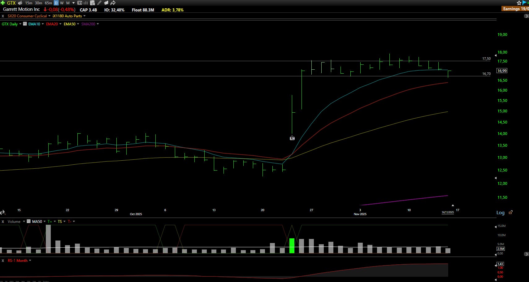 Why watch? Slower BEV adoption and resilient ICE/hybrid demand favor Garrett, which is also expanding into data-center generator sets. Management guided to āover $100Mā of 2025 stationary-power sales and booked $40M+ of new genset awards in Q3. Q3 2025 net sales were $902M (+6% cc), adjusted EBITDA $133M (14.7% margin), and adjusted FCF $107M; outlook midpoint for 2025 was raised. Shares near ATHs inside a Darvas box with minimal overhead supply left; a low-volume consolidation is in progress. Prefer a couple more days of tight consolidation (20ema catching up), but 16.70 remains a key level buyers must defend.