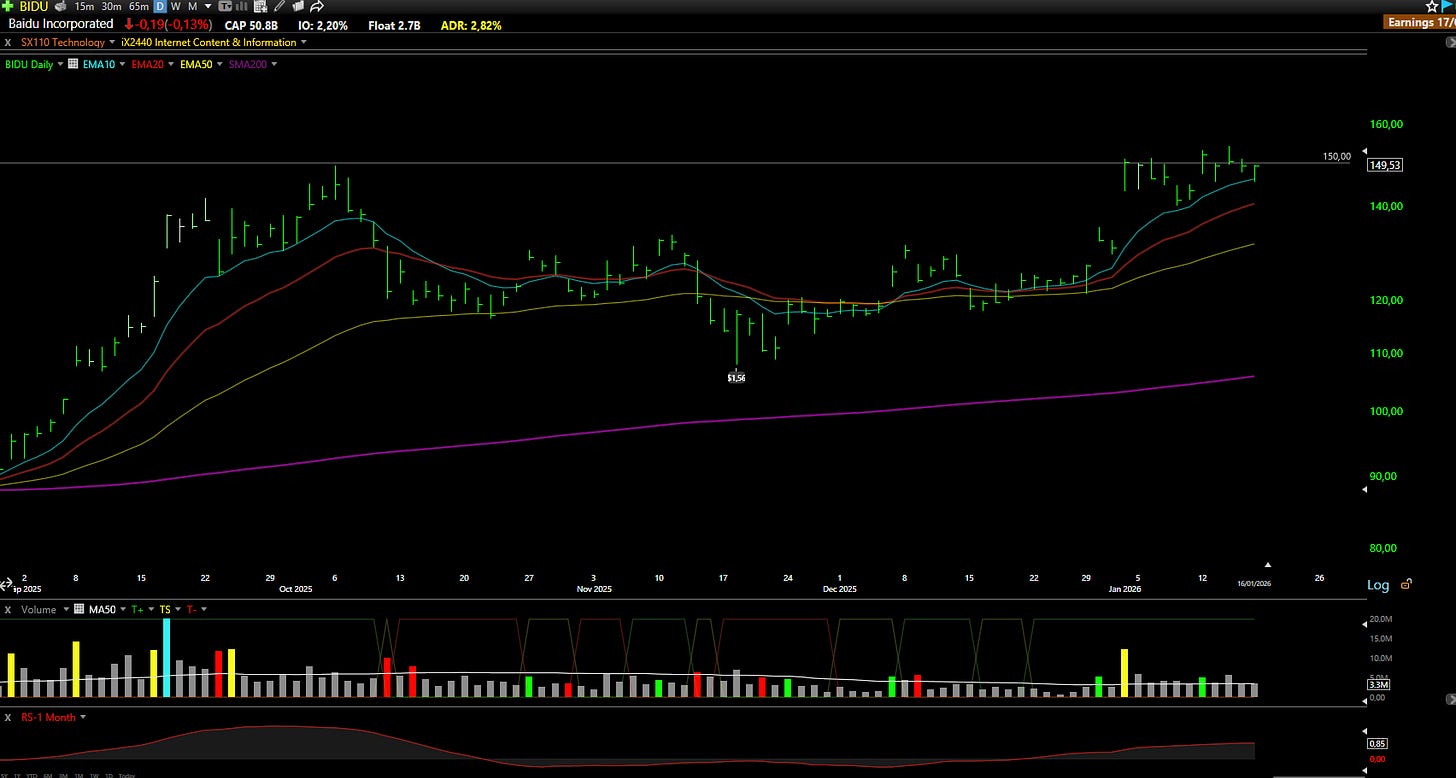 Technical Outlook: The stock approached the $150.00 level in October and was sharply rejected. In January, the stock has already made two attempts to push above this resistance without success, but notably, the 10-day exponential moving average has provided support on both pullbacks, a sign of underlying demand. The stock is now setting up for a third attempt at breaking $150.00. If this attempt succeeds on strong volume, it could mark the beginning of a new long-term uptrend. The key question is whether the third time will be the charm. If you believe China can be one of the dominant themes of 2026, Baidu is likely to be among the leaders, if not the leader, in the technology sector.