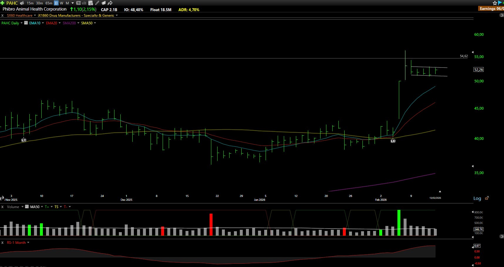 Technical Outlook: The stock was recently rejected at all-time highs of $54.62 and has since formed a very narrow Darvas box, a consolidation range of just $2.00 from low to high. This tight range indicates indecision but also compression, which often precedes a significant move. However, we generally prefer to see more than just a couple of days of consolidation before entering, as very short consolidations are more prone to failure. A few additional days of sideways action would increase the odds of a successful breakout. Once the stock clears the all-time high resistance at $54.62, thereâs blue sky ahead with no overhead supply, a setup that can lead to explosive moves as there are no prior resistance levels to contend with.
