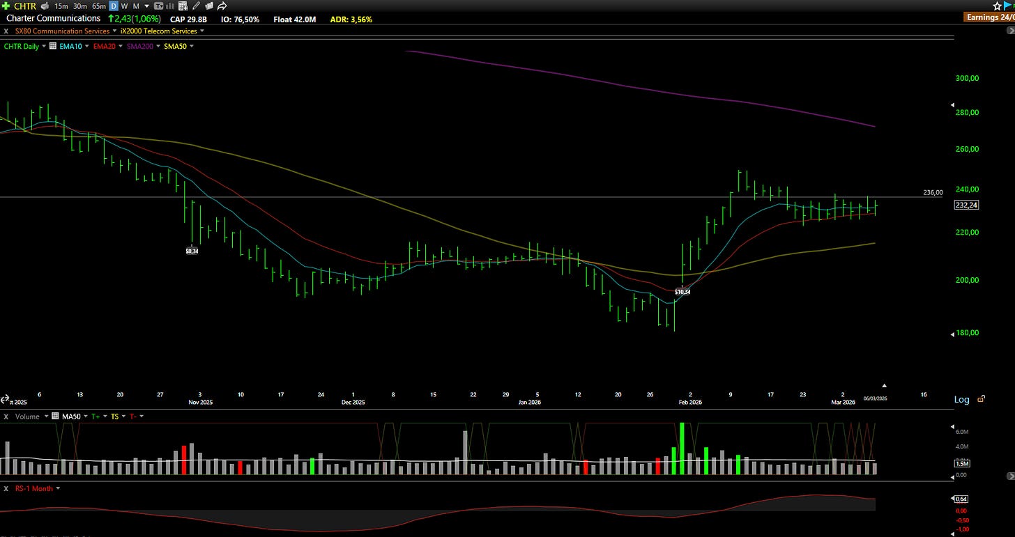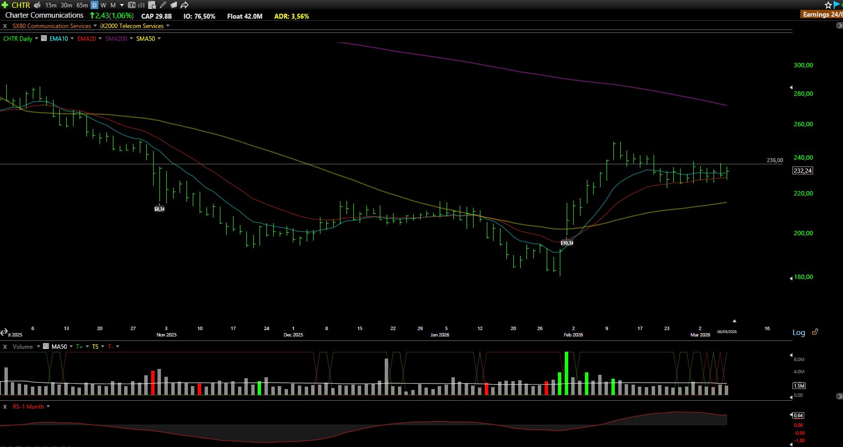 Technical Outlook: The chart setup is constructive, though it demands patience. The stock has been surfing the 20-day EMA for several sessions, but the price action has been frustrating. Every apparent breakout attempt has been met with a quick reversal. For nearly two weeks, the stock has traded in an almost perfectly sideways range just below the $236.00 level, which has emerged as the clear line in the sand. A decisive close above $236.00 is the trigger that would open the door to the next leg higher. Notably, in a market environment that has been broadly challenging, Charter has been displaying impressive relative strength—holding its ground while many other names have struggled. That kind of resilience in a difficult tape is often a precursor to outperformance when conditions improve.