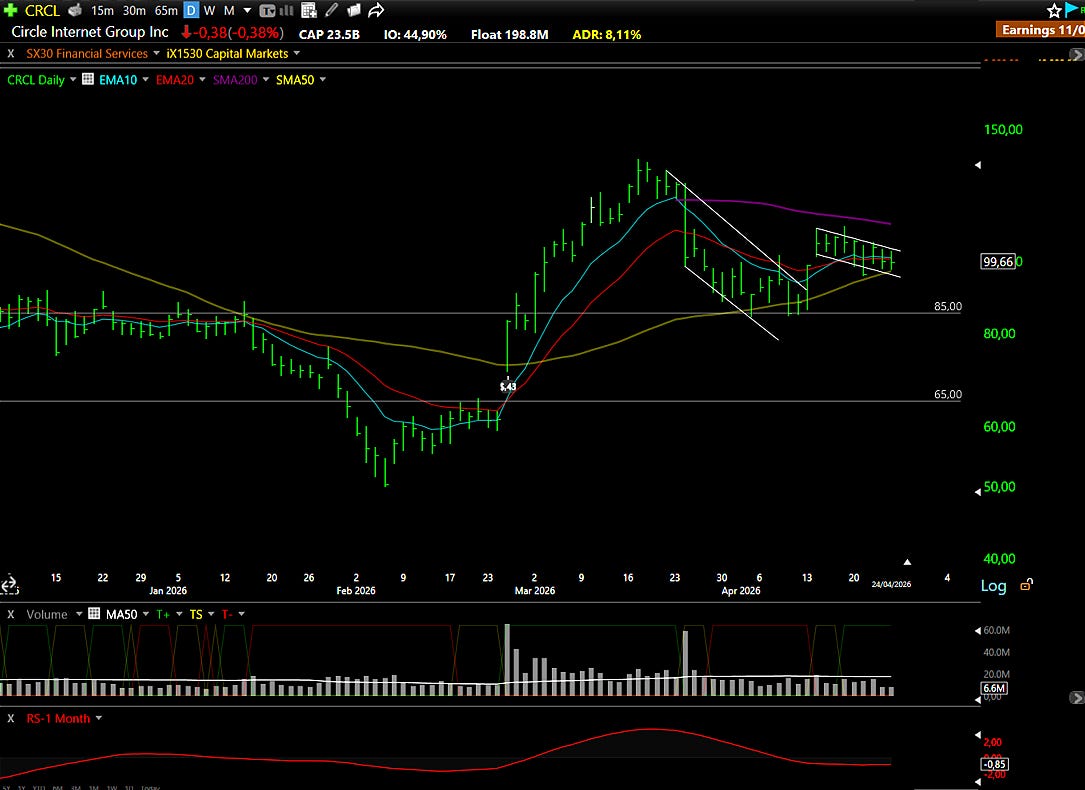 Technical Outlook: The stock has given back most of its gains from the earnings-driven surge earlier this year, but has found consistent support at the $85.00 level on multiple occasions, a clear line in the sand that also coincides with the 50-day simple moving average. For a stock with an 8% average daily range, the most recent session’s move of just 0.38% is remarkable compression. That kind of stillness in a volatile name typically precedes a meaningful directional move. The risk-reward in this handle formation is attractive, and the setup becomes actionable on a convincing break above the $100 to $102 range on elevated volume. If the broader market stabilizes and the stablecoin narrative continues to develop favorably, this could be one of the more important themes of the next several months.