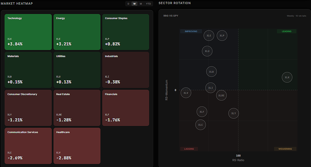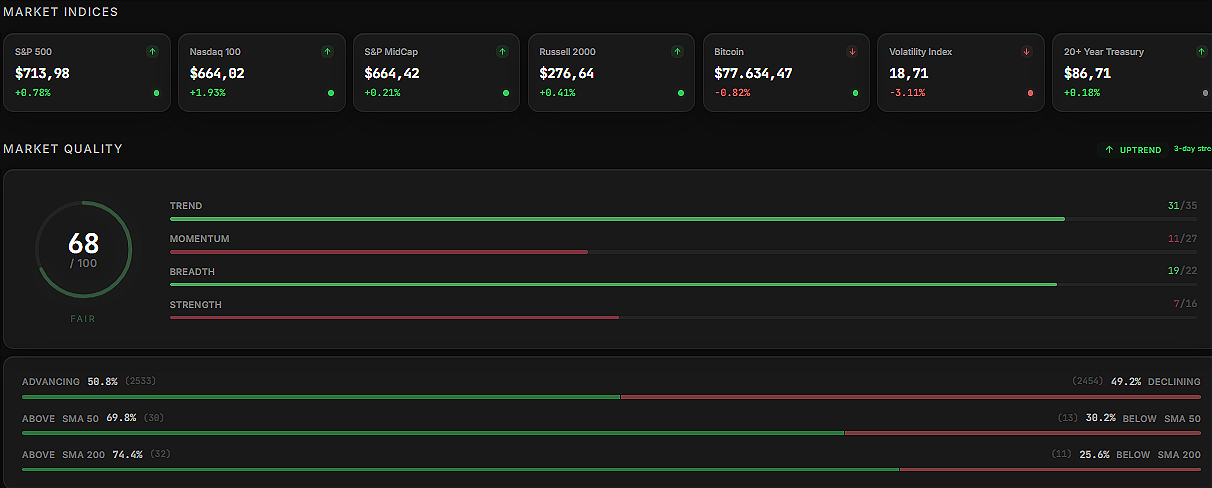 Our system is currently flagging what we define as a maximum overextension signal across the sector. Historically, when this condition appears, a pullback tends to follow within three to five trading sessions.