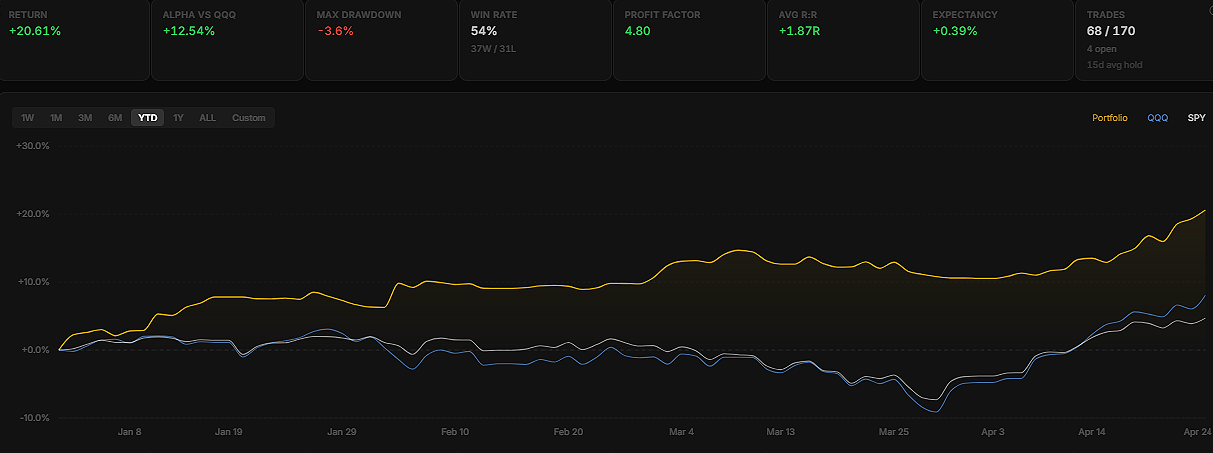 Paid members get real-time alerts: exact entries, stops, position sizing, and the thesis behind every trade. The same information we use to manage our own capital.